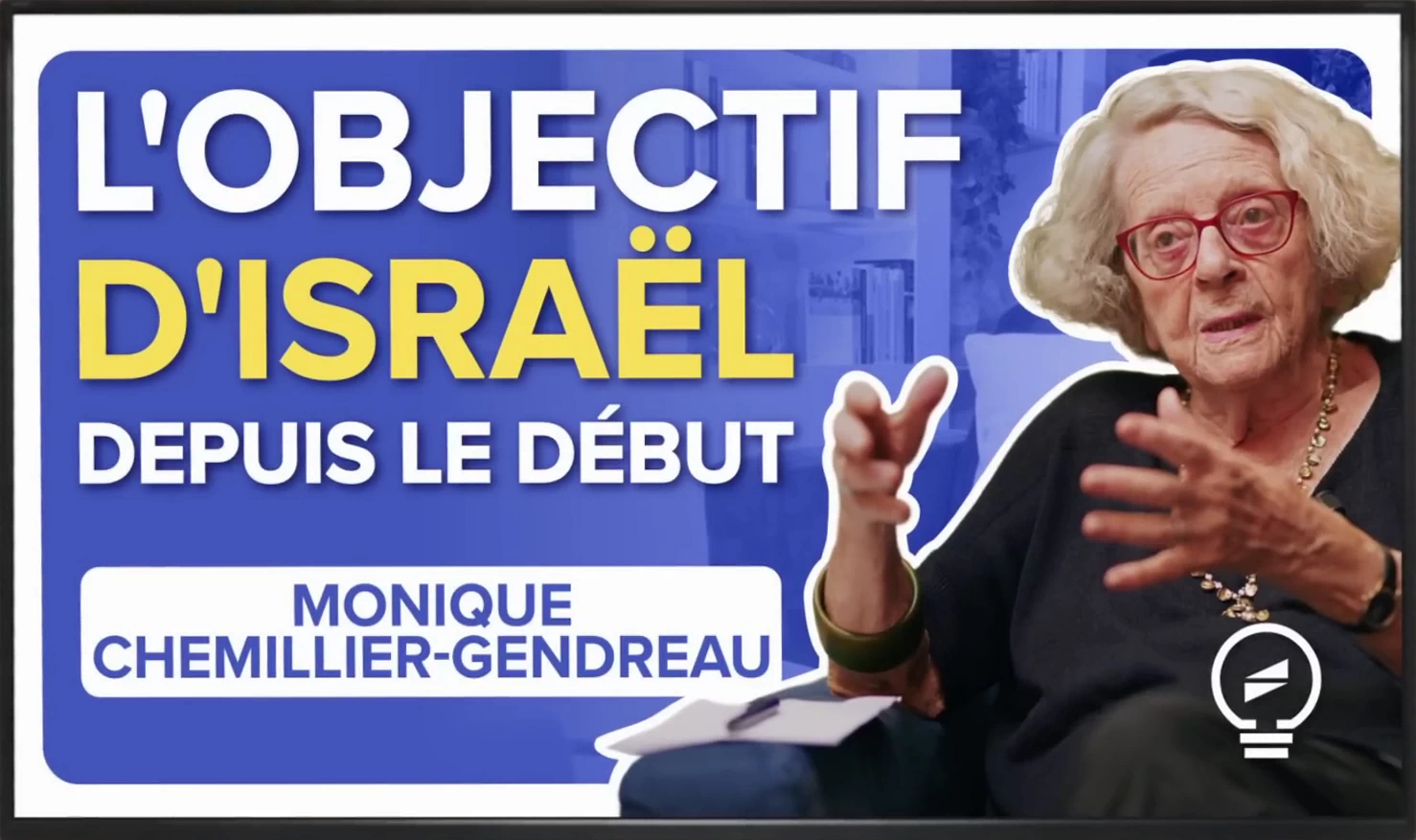 «Origines du sionisme et mensonges d'Israël: 75 ans de déshonneur; L'objectif d'Israël depuis le début» est un entrevue avec Dame Monique Chemillier-Gendreau Monique Chemillier-Gendreau (1935-04-15) interviewée par Olivier Berruyer Olivier Berruyer (1975-10-26), fondateur du média Élucid, sur enregistrement vidéo. Le textes de cette page est la transcription du dialogue de cet entretien révélateur.