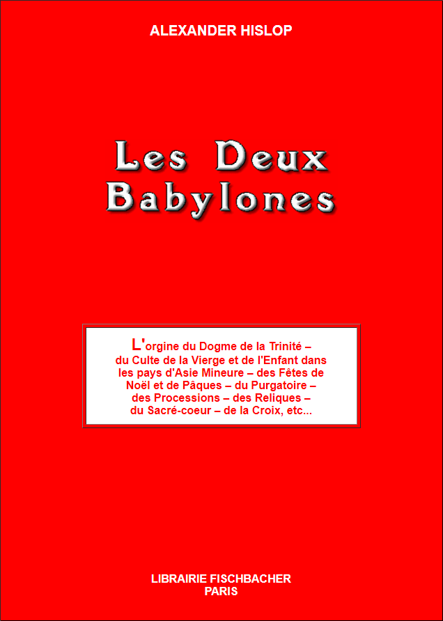 Les deux Babylones publié en 1853, 1858 et 1916. Le Catholicisme finalement révélé être la religion solaire du Culte de Mythra sous un déguisement chrétien. L'orgine du Dogme de la Trinité – du Culte de la Vierge et de l'Enfant dans les pays d'Asie Mineure – des Fêtes de Noël et de Pâques – du Purgatoire – des Processions – des Reliques – du Sacré-coeur – de la Croix, etc...